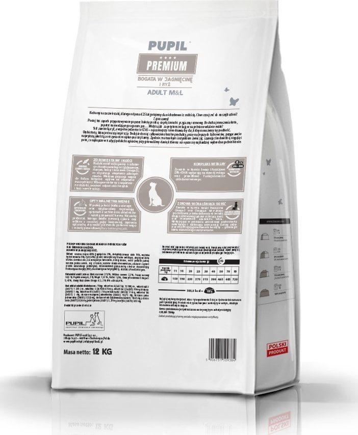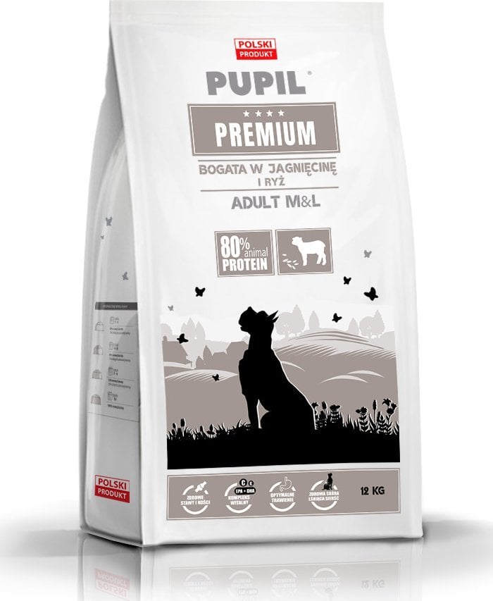 Ξηρά τροφή για σκύλους PUPIL Premium M&L, πλούσια σε αρνίσιο κρέας και ρύζι, συσκευασία 12 κιλών.