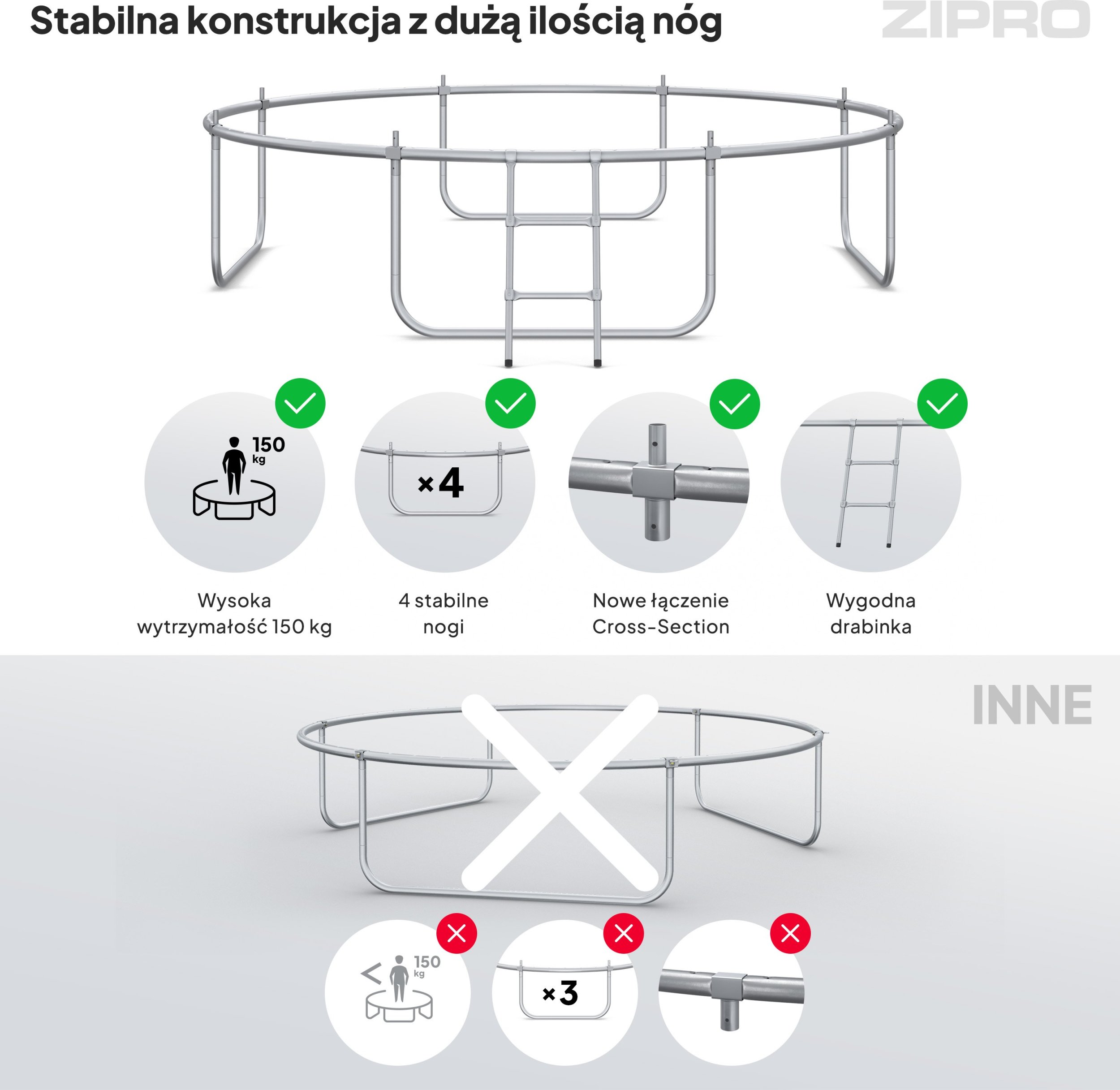 Στα τραμπολίνα ZIPRO JumpPro IN χρησιμοποιείται βελτιωμένο σύστημα στερέωσης με το στοιχείο CROSS-SECTION, το οποίο συνδέει το πλαίσιο με τα πόδια και τους στύλους του προστατευτικού διχτυού.