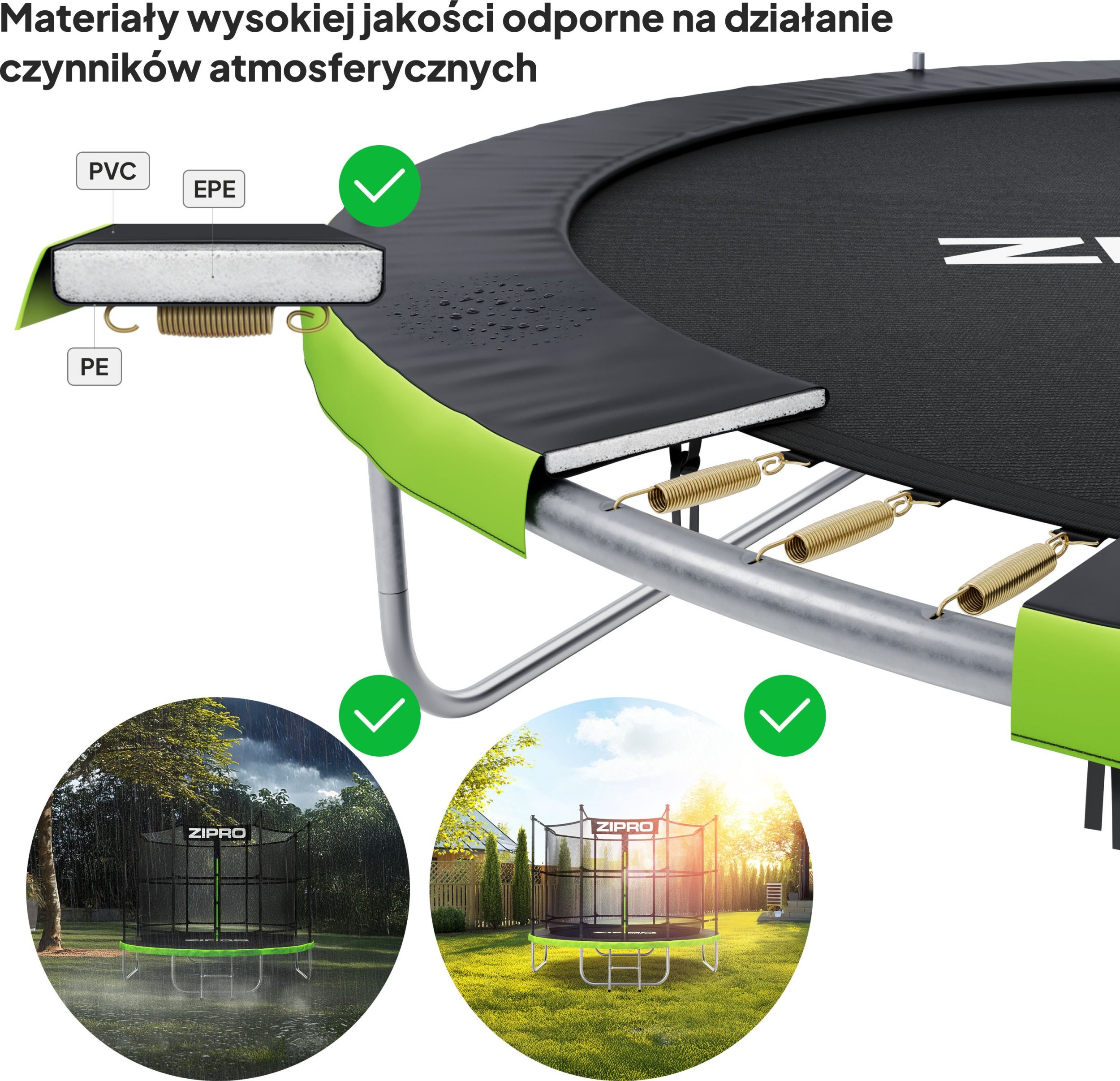 Οι σχεδιαστές της ZIPRO εξόπλισαν το τραμπολίνο με εσωτερικό προστατευτικό δίχτυ και ενισχυμένη κατασκευή, ώστε η χρήση του να συνδέεται μόνο με ευχάριστες στιγμές παιχνιδιού.