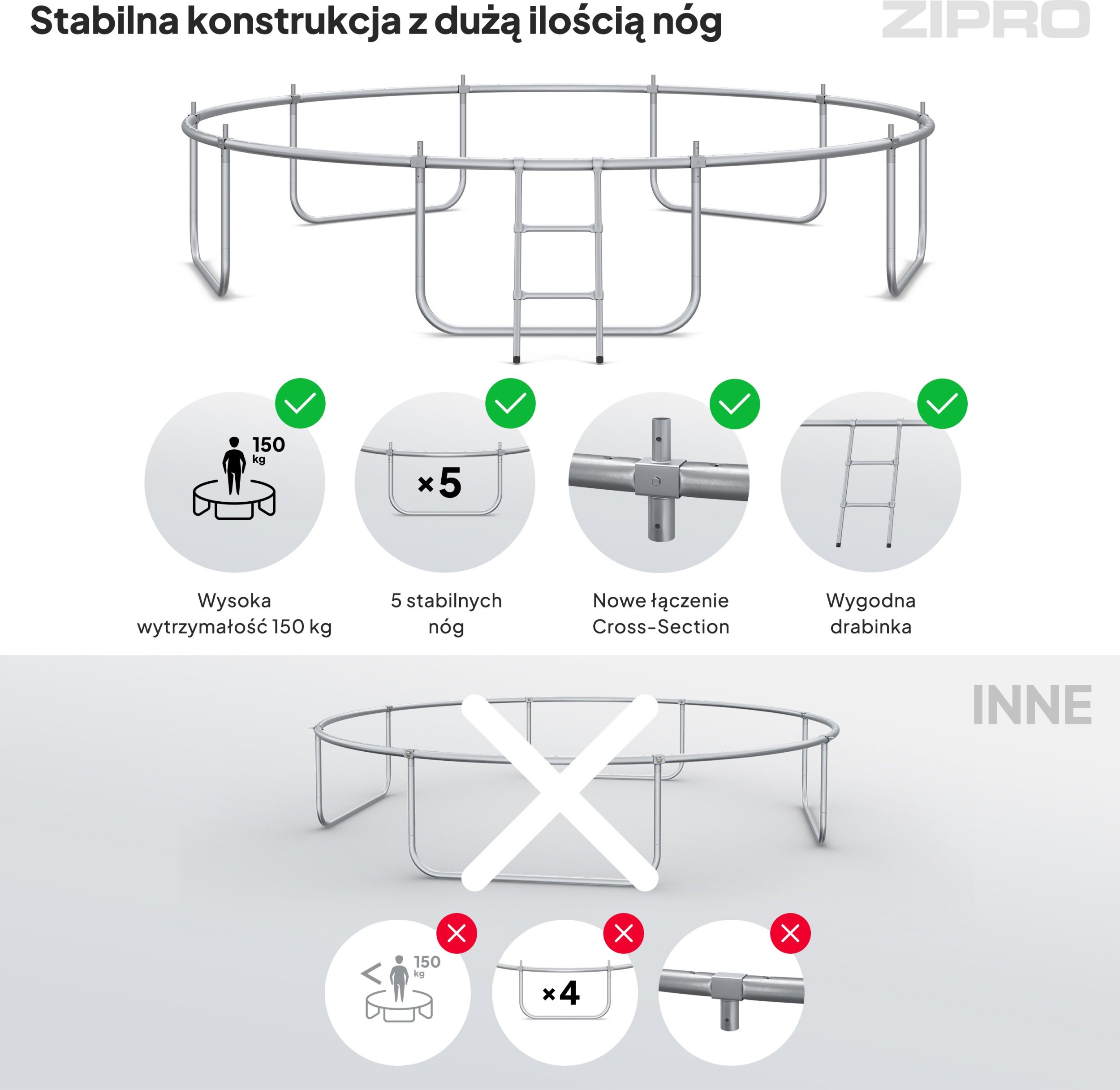 Στα τραμπολίνα ZIPRO JumpPro PREMIUM χρησιμοποιείται βελτιωμένο σύστημα στερέωσης, στο οποίο το στοιχείο CROSS-SECTION συνδέει το πλαίσιο με τα πόδια και τους στύλους του προστατευτικού διχτυού.