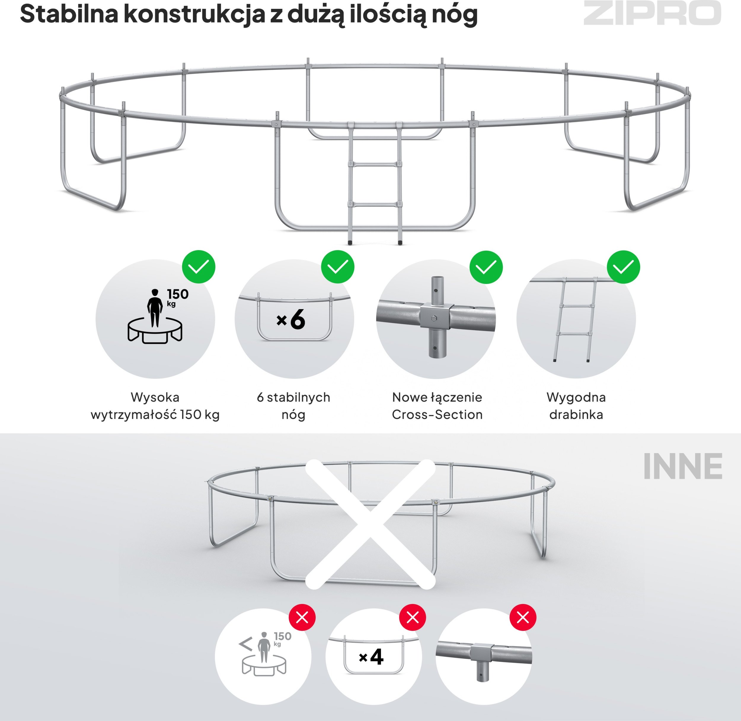 Στα τραμπολίνα ZIPRO εφαρμόζεται ένα εξελιγμένο σύστημα σύνδεσης, όπου το στοιχείο CROSS-SECTION ενώνει τον σκελετό με τα πόδια και τις κολώνες του διχτυού.