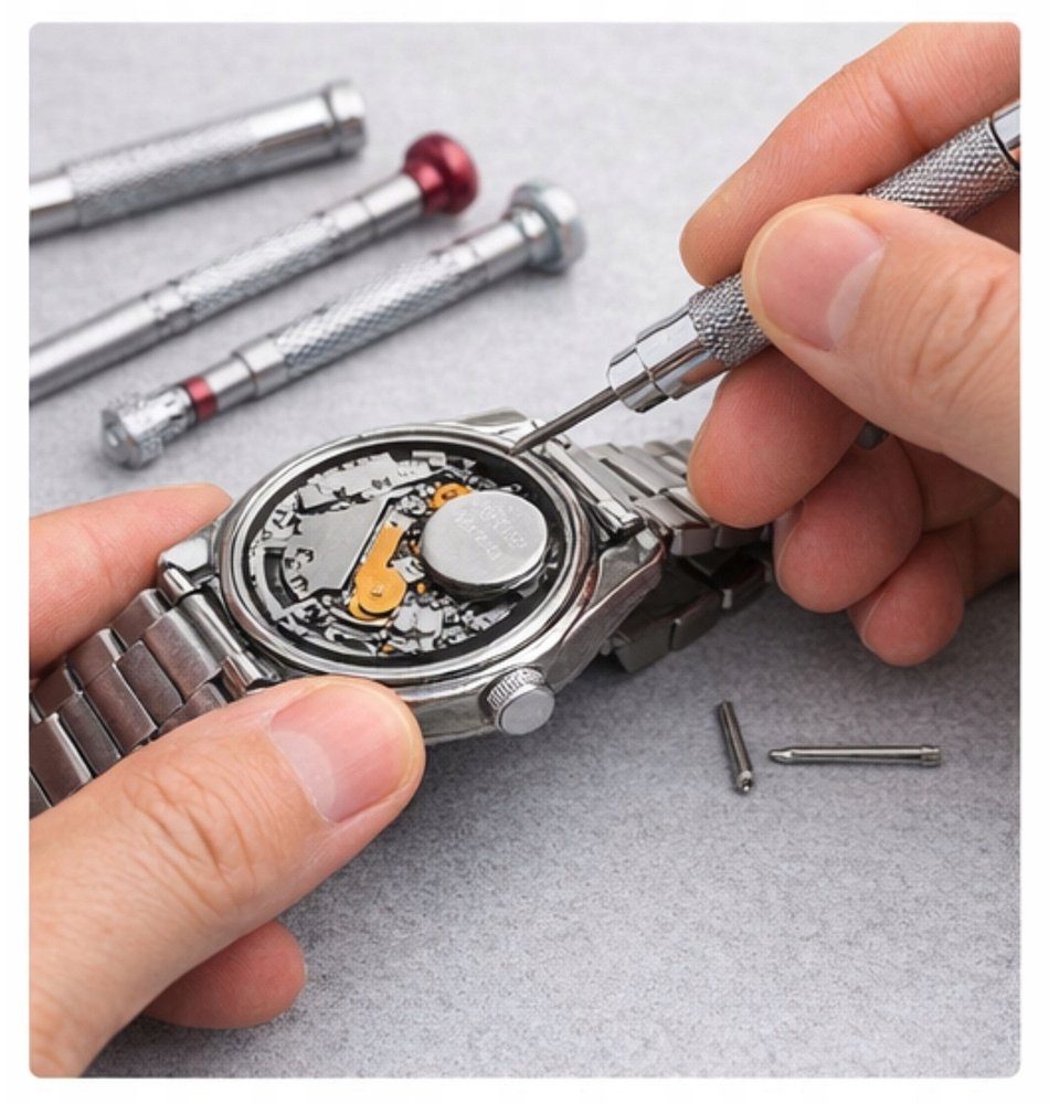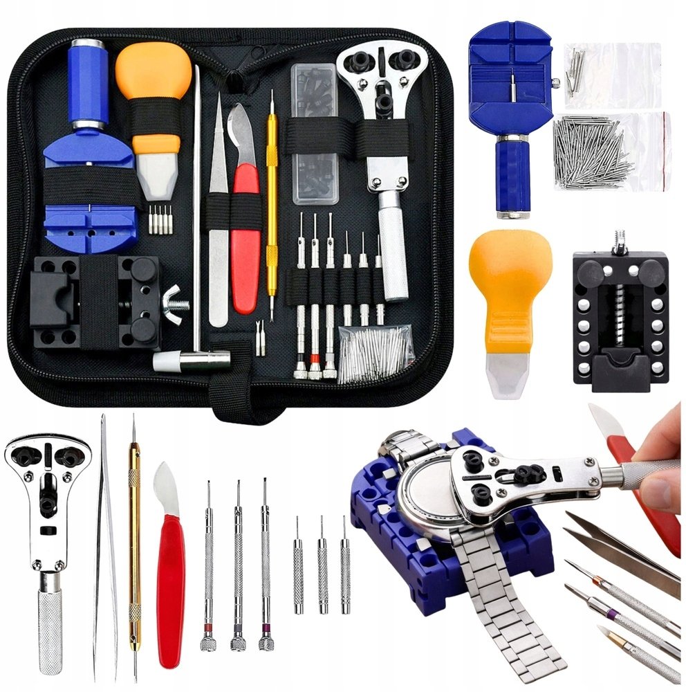 Επαγγελματικό σετ επισκευής ρολογιών με 147 εξαρτήματα και εργαλεία, όλα σε πρακτική θήκη για εύκολη αποθήκευση.