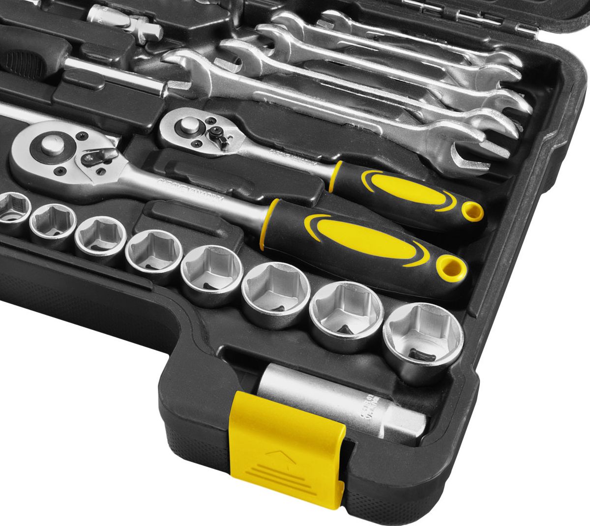 Σετ 65 κλειδιών συναρμολόγησης FDG 5003-65R Το σετ εργαλείων αποτελείται από εξήντα πέντε μέρη, συμπεριλαμβανομένων καστάνιας 1/4 και 3/8 ιντσών και υποδοχές από 7 έως 24 χιλιοστά σε ποιότητα CR-V. Αναπόσπαστο μέρος του σετ είναι οι πλευρικές πένσες κοπής, οι εκτεταμένες ίσιες πένσες και οι ρυθμιζόμενες πένσες. Υπάρχουν επίσης σετ κλειδιών και κατσαβιδιών. Τα εργαλεία τοποθετούνται σε πλαστικό κουτί εξοπλισμένο με εργονομική λαβή που βρίσκεται μόνο στη μία πλευρά του κουτιού, ώστε να είμαστε σίγουροι ότι θα το ανοίγουμε πάντα από τη δεξιά πλευρά και θα αποφεύγουμε να χυθούν τα εργαλεία. Ορίστε τα περιεχόμενα Κλειδιά 12x - 1/4": 4;4,5;5;5,5;6;7;8;9;10;11;12;13 mm Κλειδιά υποδοχής 11x - 3/8": 10,11,12,13,14,15,17,19,21,22,24 mm 2x - Universal άρθρωση: 1/4" και 3/8" 2x - Μπουζόκλειδο αυτοκινήτου 3/8": 16 mm και 21 mm 2x - Λαβή καστάνιας και ανακλινόμενη κεφαλή: 1/4" και 3/8" 1x - Ενδιάμεσο κομμάτι 2x - Κατσαβίδι (-)(+) 6x100 mm 20x - Bits x μήκος 25 mm:(+)0-1-2-3,(-)2-3-4-5-6-7. (*)0-1-2-3,(H)2-3-4-5-6-7(S)0-1-2-3,(T)10-15-20-25-30-40 . 1x - Λαβή με εκτεταμένες σιαγόνες: 6" 1x - Λαβίδες με συρόμενη άρθρωση: 10" 1x - Πλαϊνή πένσα: 6" 1x - Κόφτες: 7" 5x - Ανοιχτό κλειδί: 6x7,8x9,10x11,12x13,14x17 mm 1x - Λαβή κλειδιού υποδοχής{Συσκευασία} Βαλίτσα. {Συσκευασία} Βαλίτσα. {Αριθμός στοιχείων στο σετ} 65 . {Αριθμός στοιχείων στο σετ} 65 . {Υλικό συσκευασίας} Πλαστικό. {Υλικό συσκευασίας} Πλαστικό. {Torx sockets} Καμία . {Torx sockets} Καμία . {Πρίζες Dodeca} Καμία . {Πρίζες Dodeca} Καμία . {Ανοιχτά κλειδιά} Κανένα . {Ανοιχτά κλειδιά} Κανένα . {T-Knobs} Κανένα . {T-Knobs} Κανένα . {Κλειδιά Άλεν} Κανένα . {Κλειδιά Άλεν} Κανένα . {Πρίζες κεριών} περιλαμβάνονται. {Πρίζες κεριών} περιλαμβάνονται. {Μακρές πρίζες} Ναι. {Μακρές πρίζες} Ναι. {Short sockets} Ναι. {Short sockets} Ναι. Περιλαμβάνονται {Επεκτάσεις}. Περιλαμβάνονται {Επεκτάσεις}. Περιλαμβάνονται {Αρθρώσεις}. Περιλαμβάνονται {Αρθρώσεις}. Περιλαμβάνονται {Rattles}. Περιλαμβάνονται {Rattles}. Περιλαμβάνεται {Πένσα}. Περιλαμβάνεται {Πένσα}. {Hex sockets} Περιλαμβάνονται . {Hex sockets} Περιλαμβάνονται . Περιλαμβάνονται {Bits} . Περιλαμβάνονται {Bits} . Περιλαμβάνονται {κατσαβίδια}. Περιλαμβάνονται {κατσαβίδια}