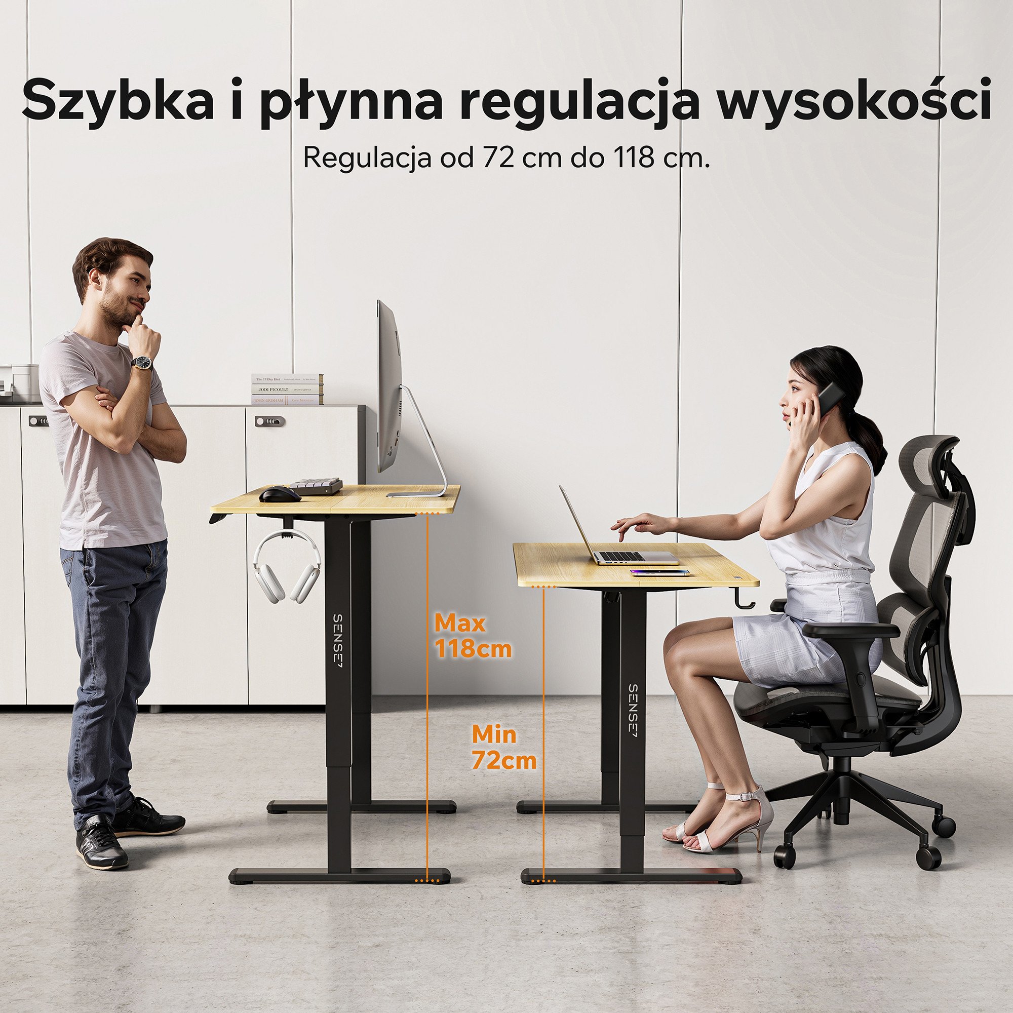 Το ύψος ρυθμίζεται στο εύρος 72–118 cm. Με τα κουμπιά πάνω και κάτω μπορείς εύκολα να προσαρμόσεις το ύψος της επιφάνειας.